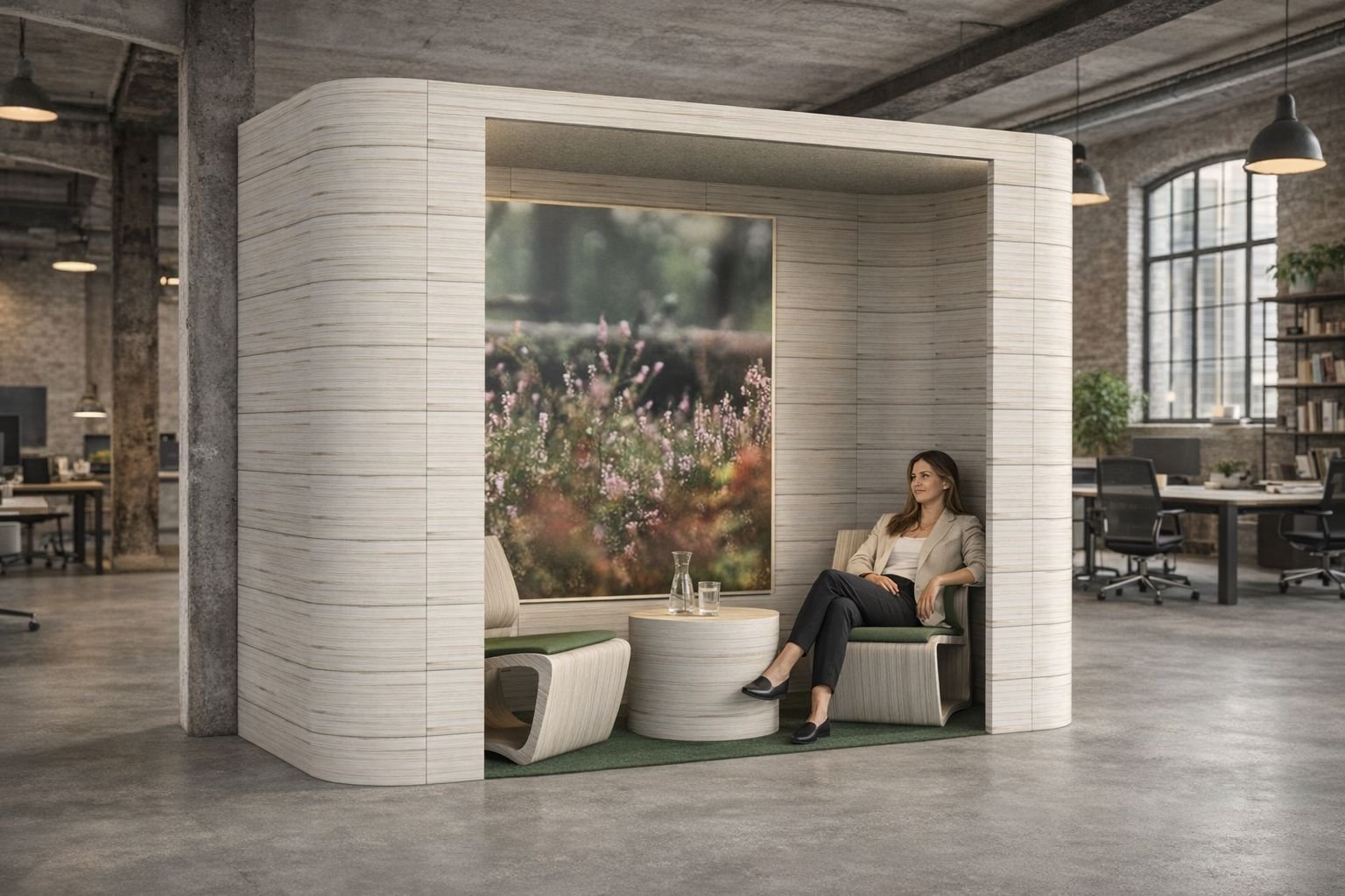 Työympäristö ei saisi kuluttaa ihmistä nopeammin kuin luonto palauttaa. Rakennamme modulaarisia tiloja, jotka laskevat tutkitusti kuormitusta, parantavat keskittymistä ja kirkastavat ajattelua. Kyse ei ole vain viihtyvyydestä, vaan toimintakyvyn ja tuottavuuden lisäämisestä. Luonnossa palautuminen alkaa minuuteissa. Nyt se on osa työpäivää.
